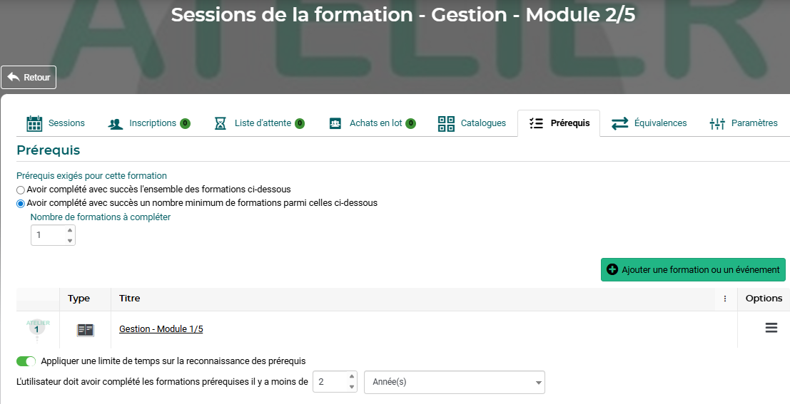 ![]() | L'onglet « Prérequis » de définir une ou des formations qui devront être complétées avant que l'inscription puisse se faire. Les paramètres permettent également de reconnaitre la ou les formation(s) prérequises uniquement au cours d'un temps déterminé. Une fois cette limite de temps atteinte l'utilisateur aura à nouveau l'obligation de compléter la ou les formation(s) prérequise(s). |